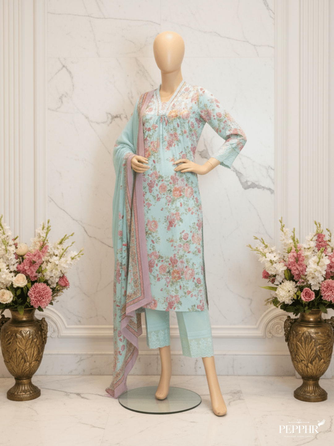 Introducing Aabroo from Pepphr’s Pastel Poetry Collection — a celebration of subtle grandeur and timeless elegance. Designed in premium cotton 60×60, this ensemble showcases the artistry of hand embroidery, where beads and threads meet the fluidity of a classic naira-cut silhouette.