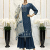 Crafted in a Rayon Silk Blend, this dark blue kurti shimmers subtly under light, giving it an elevated festive finish. The kurti features full shiny thread and sequin embroidery front and back, faux mirror work detailing at the neckline, and metallic button accents with danglings that add a regal flair.
