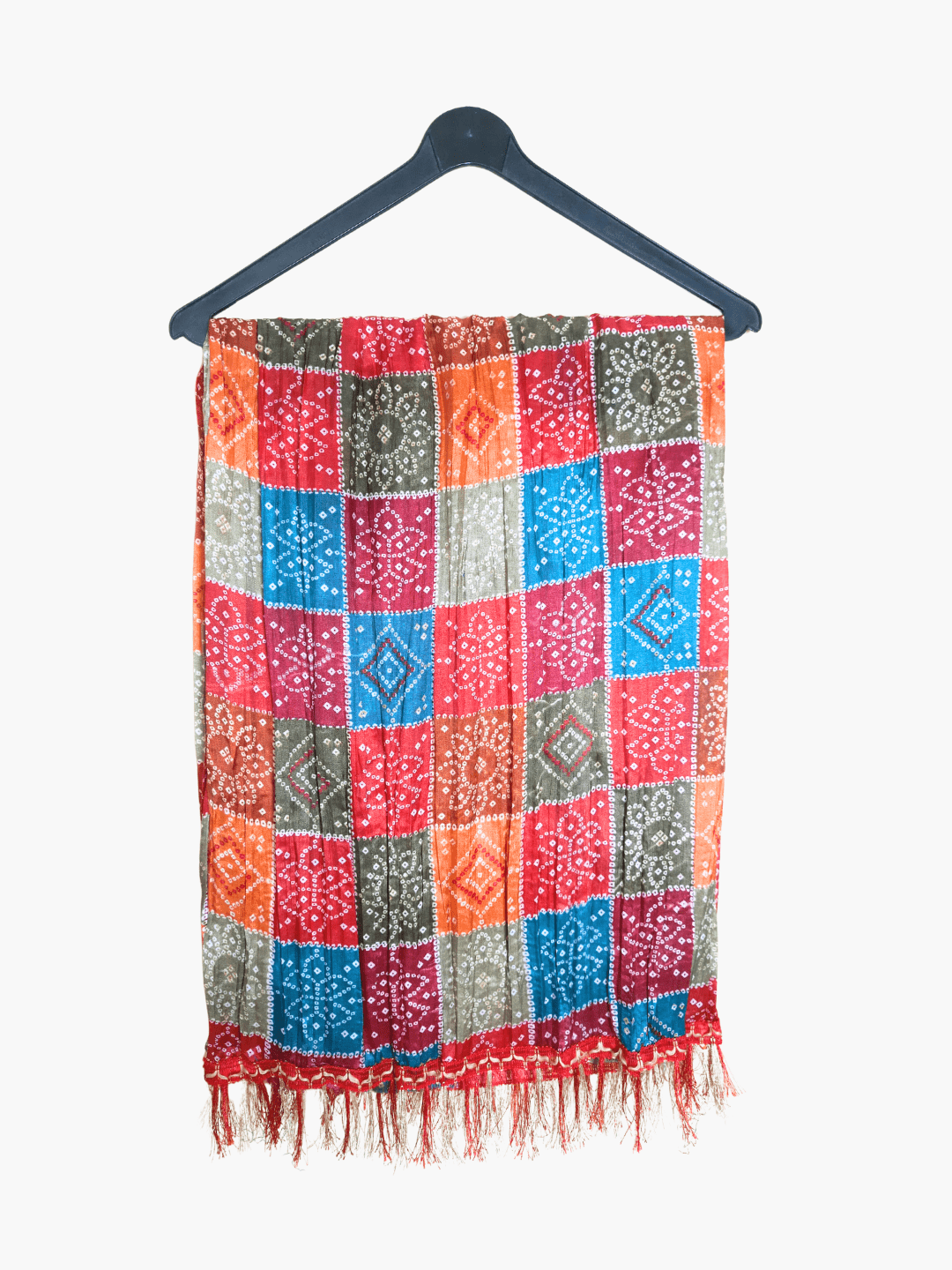 • A luxurious Bandhani-printed silk dupatta in vibrant hues of red, blue, mustard, green, and orange — adding drama, colour, and cultural richness to the serene white base