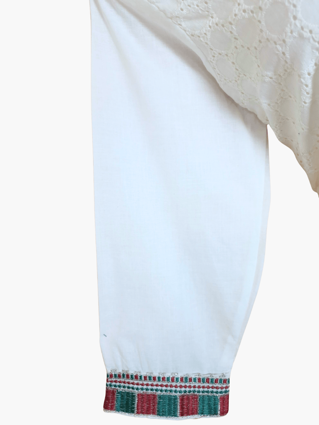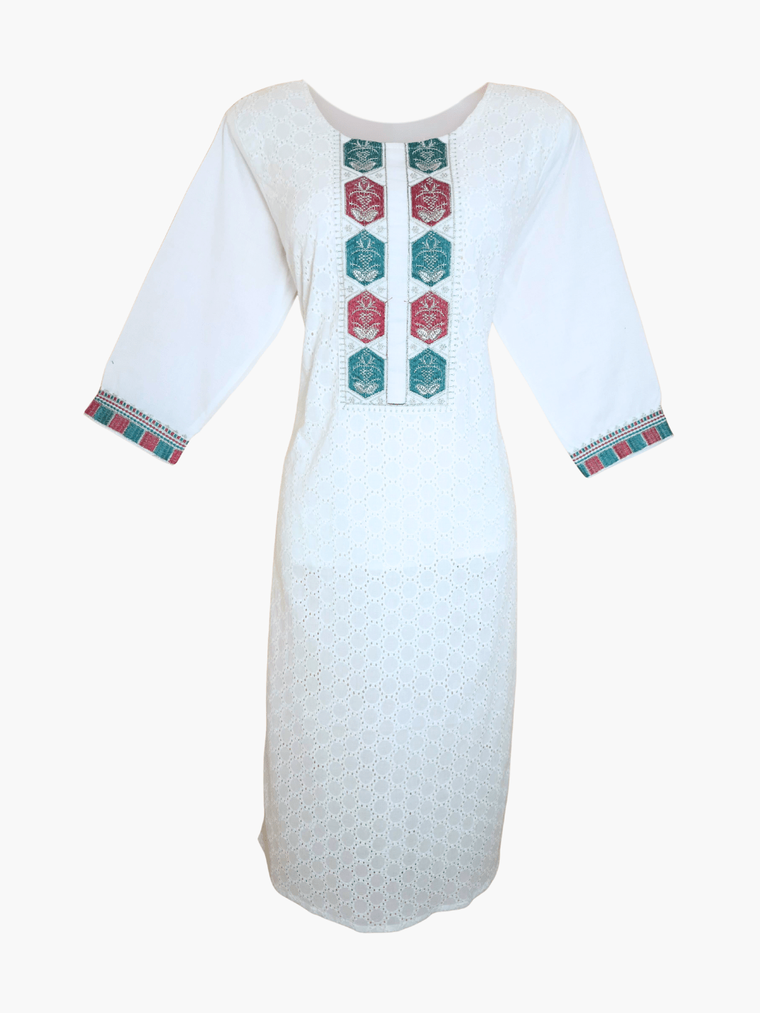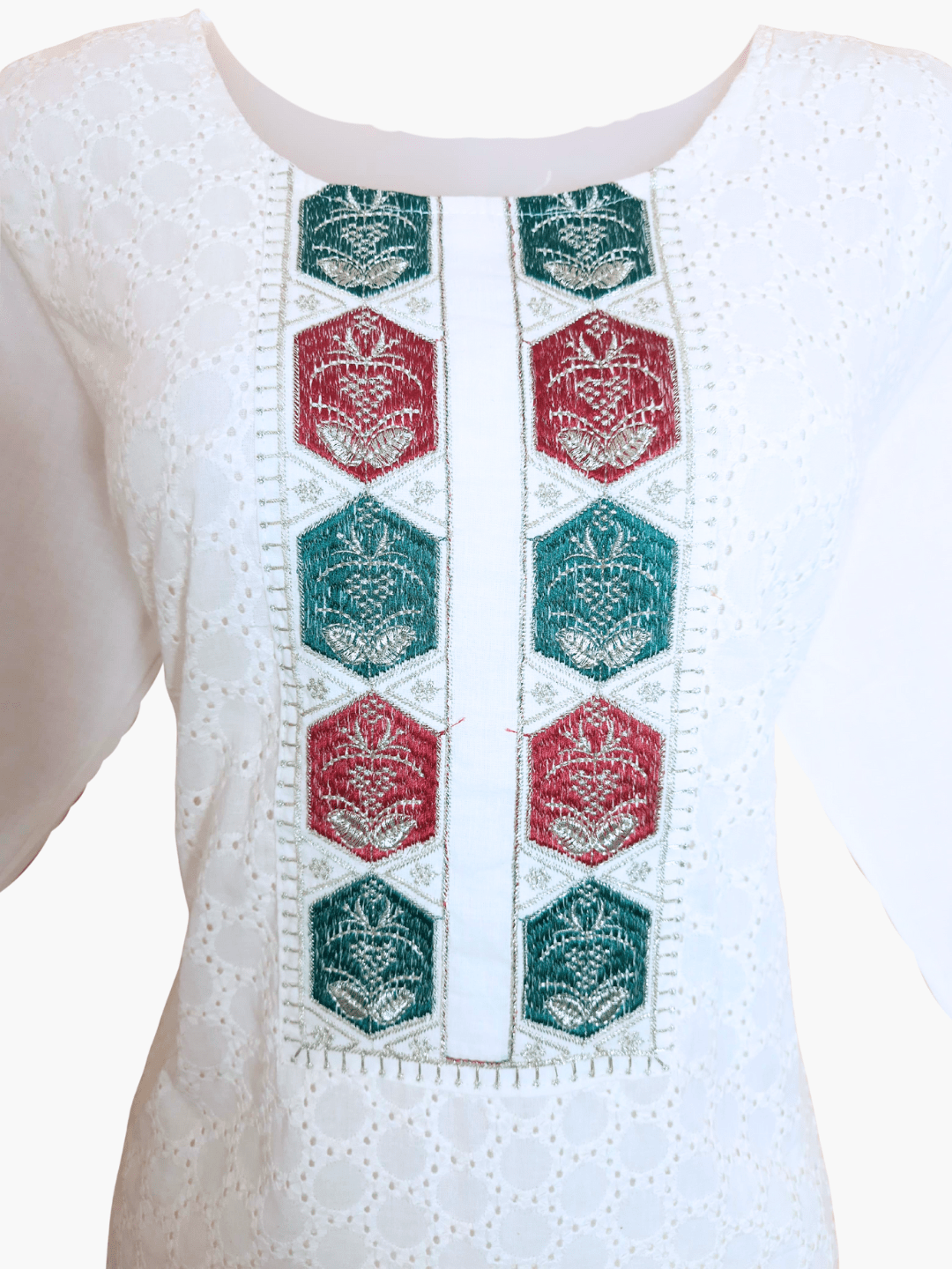 • A soft mul cotton white kurta with delicate all-over schiffli embroidery for refined texture and breathability