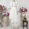 An elegant off-white cotton kurti set crafted in chikankari and dobby schiffli embroidery — paired with a soft embroidered stall dupatta that blends breathable comfort with timeless embroidery finesse.