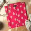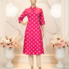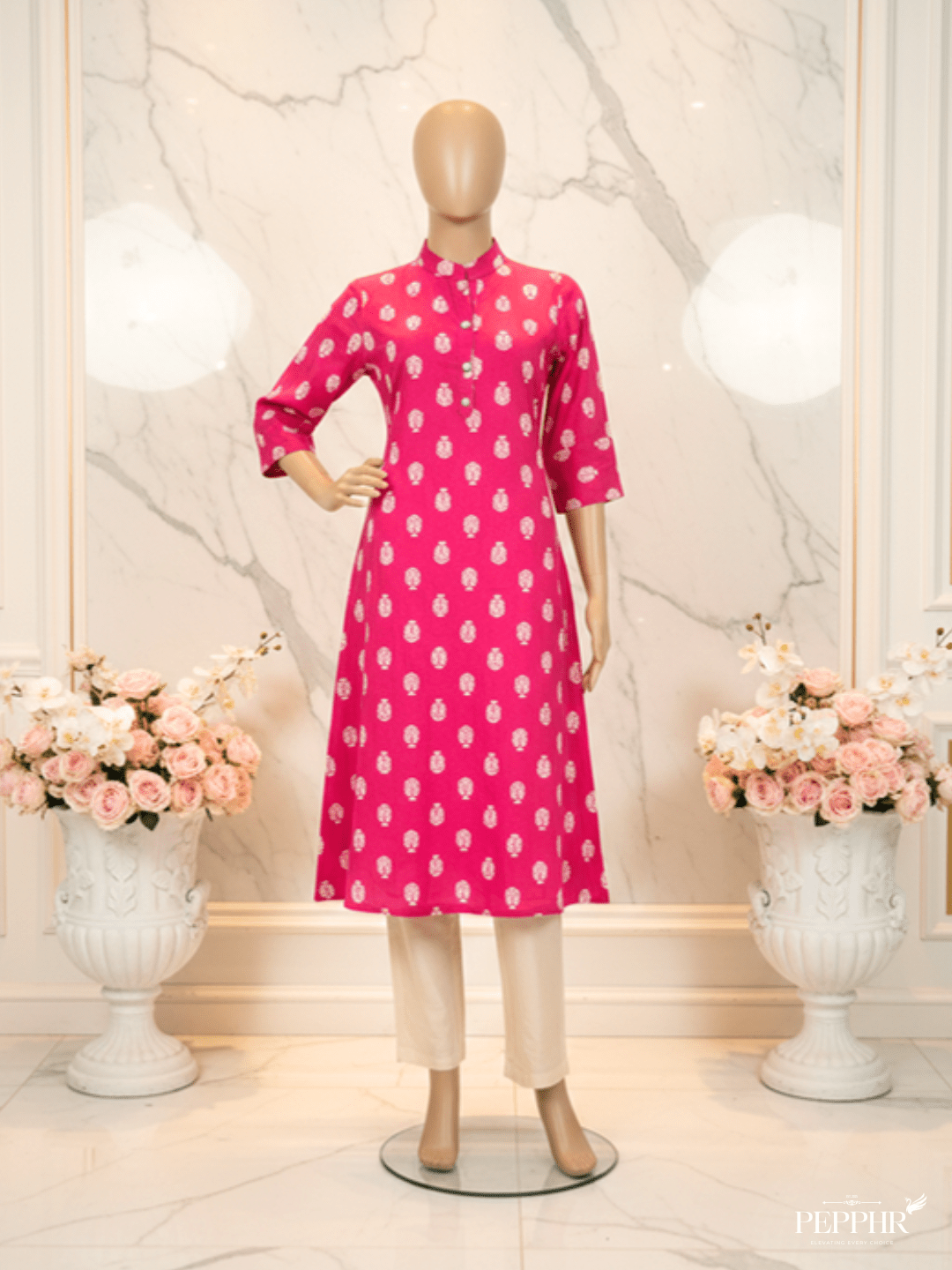 Liva-certified rayon straight kurti in a rich pink base with ivory block print, mandarin collar with handcrafted buttons, side pocket, and a structured, breathable silhouette — a premium choice for elegant everyday wear.