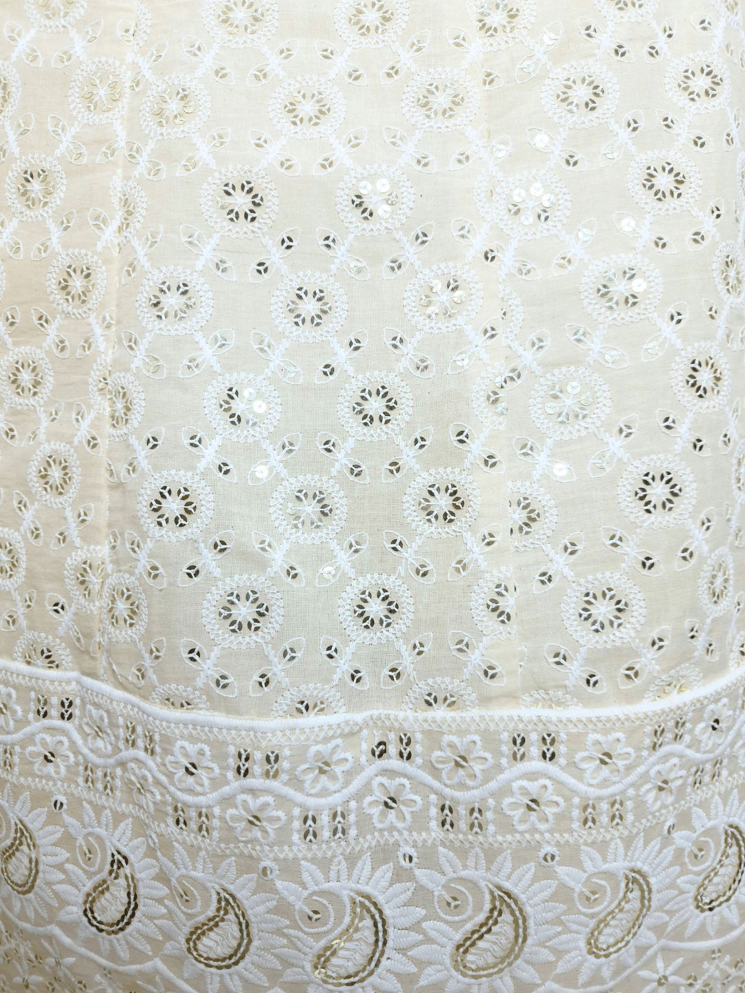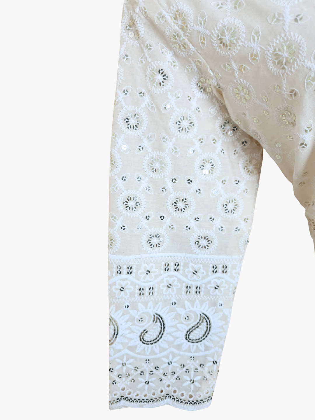 Delicate schiffli work across the sleeves and hemline for a classic chikankari appeal