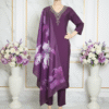 An opulent wine silk kurti set featuring intricate hand embroidery with moti, beads, faux mirror, and zari-like threadwork, paired with a digitally printed floral dupatta — a regal choice for any festive affair.