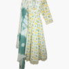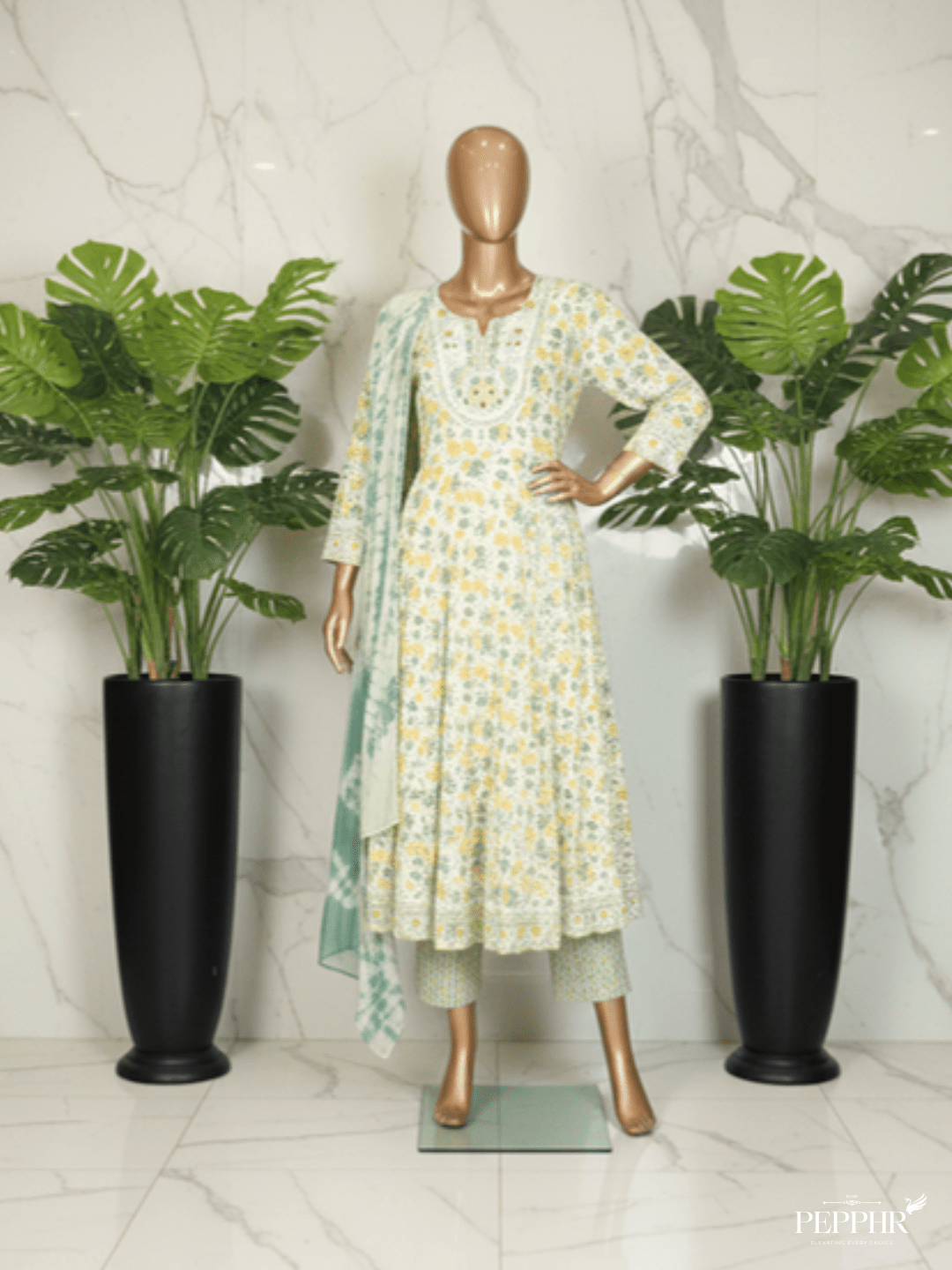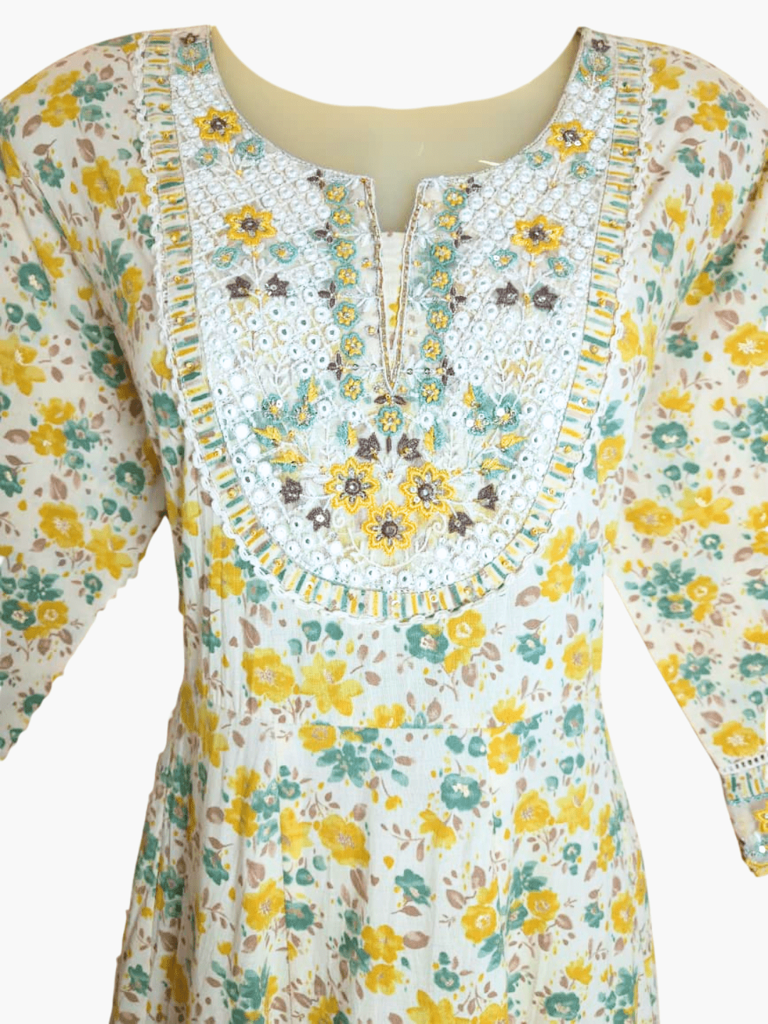A beige-yellow floral Anarkali with a gentle, breezy flare